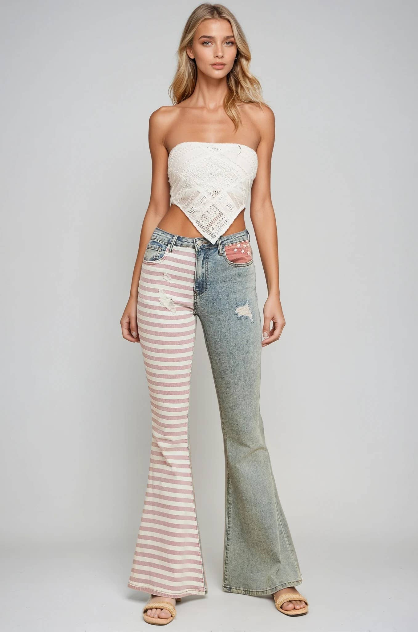 Patriotic flag bellbottom jeans with usable front and back pockets.