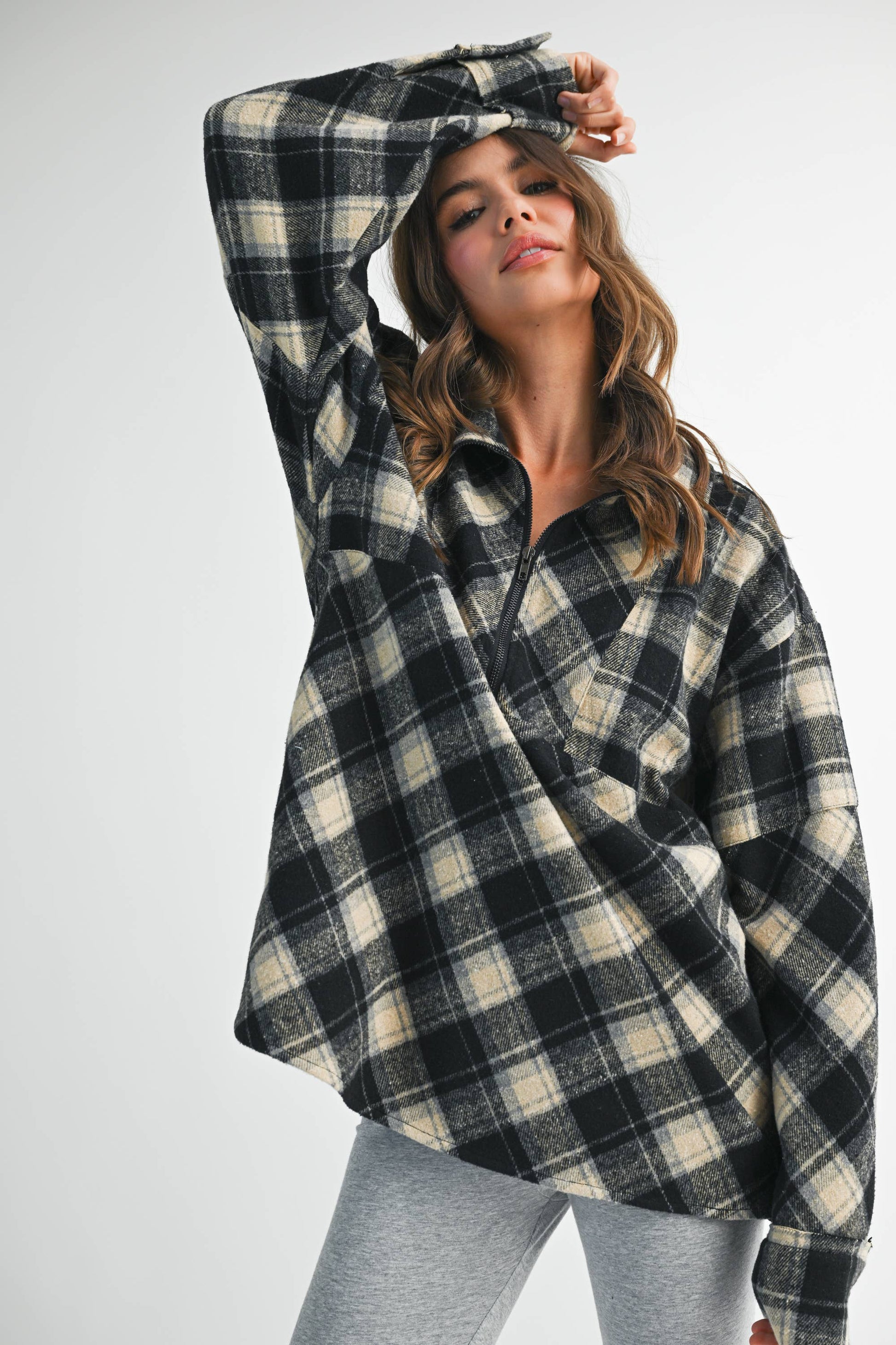 Stay cozy and chic in this oversized Mya plaid pullover, designed with a slouchy fit and versatile zip neckline. Perfect for layering up on crisp mornings or throwing on for laid-back adventures, it’s an instant cold-weather favorite.