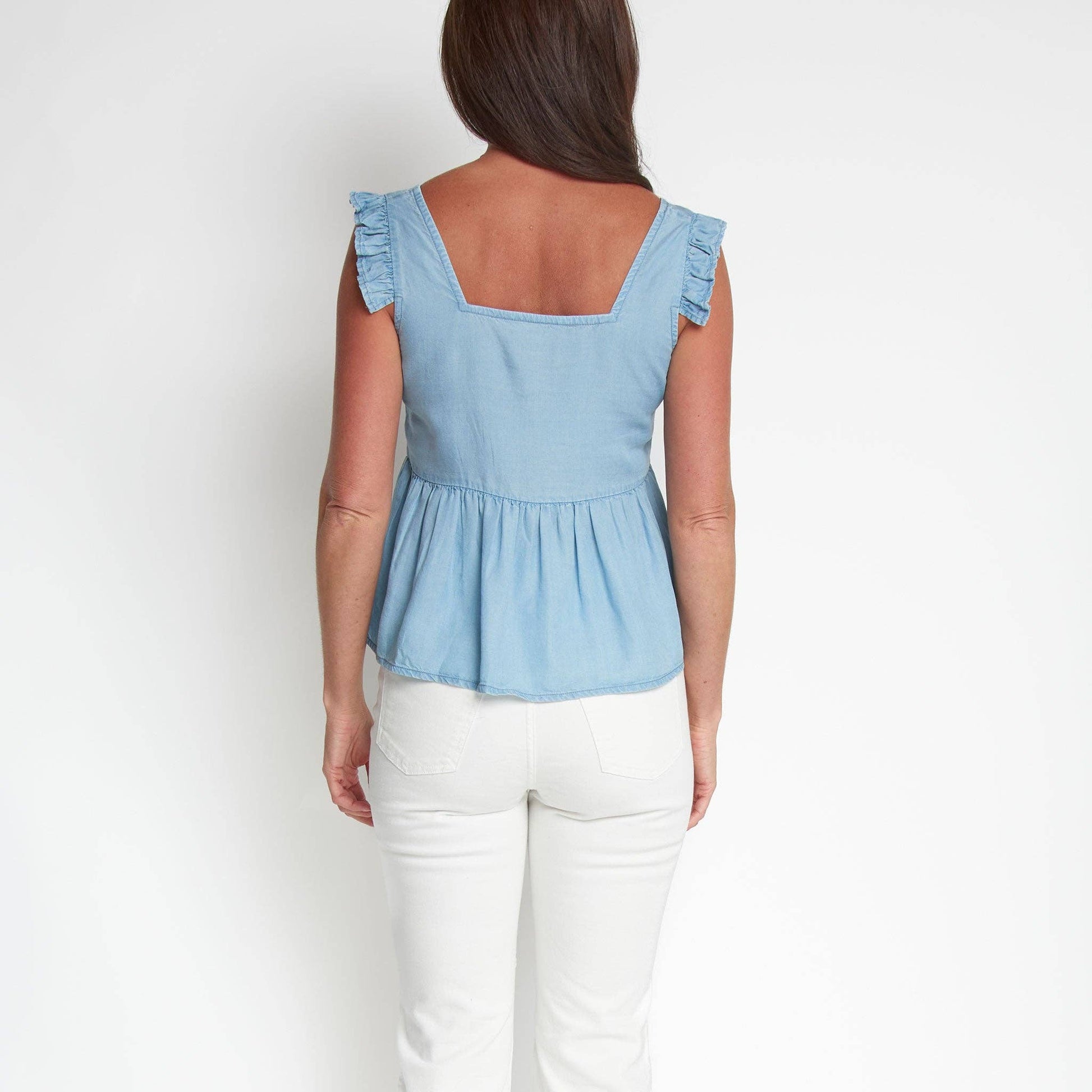 Embrace the soft romance of the Delaney Chambray Babydoll Tank Top, where timeless style meets playful charm. Crafted from a soft, faded lyocell fabric, this lightweight top drapes gracefully over your figure, offering an effortlessly flattering silhouette. The delicate square neckline adds a touch of sophistication, while the fun frill sleeves bring a hint of whimsy and movement. Perfect for sunny days and moonlit nights, the Delaney Tank is your go-to for moments that call for both comfort and a little bit of magic.