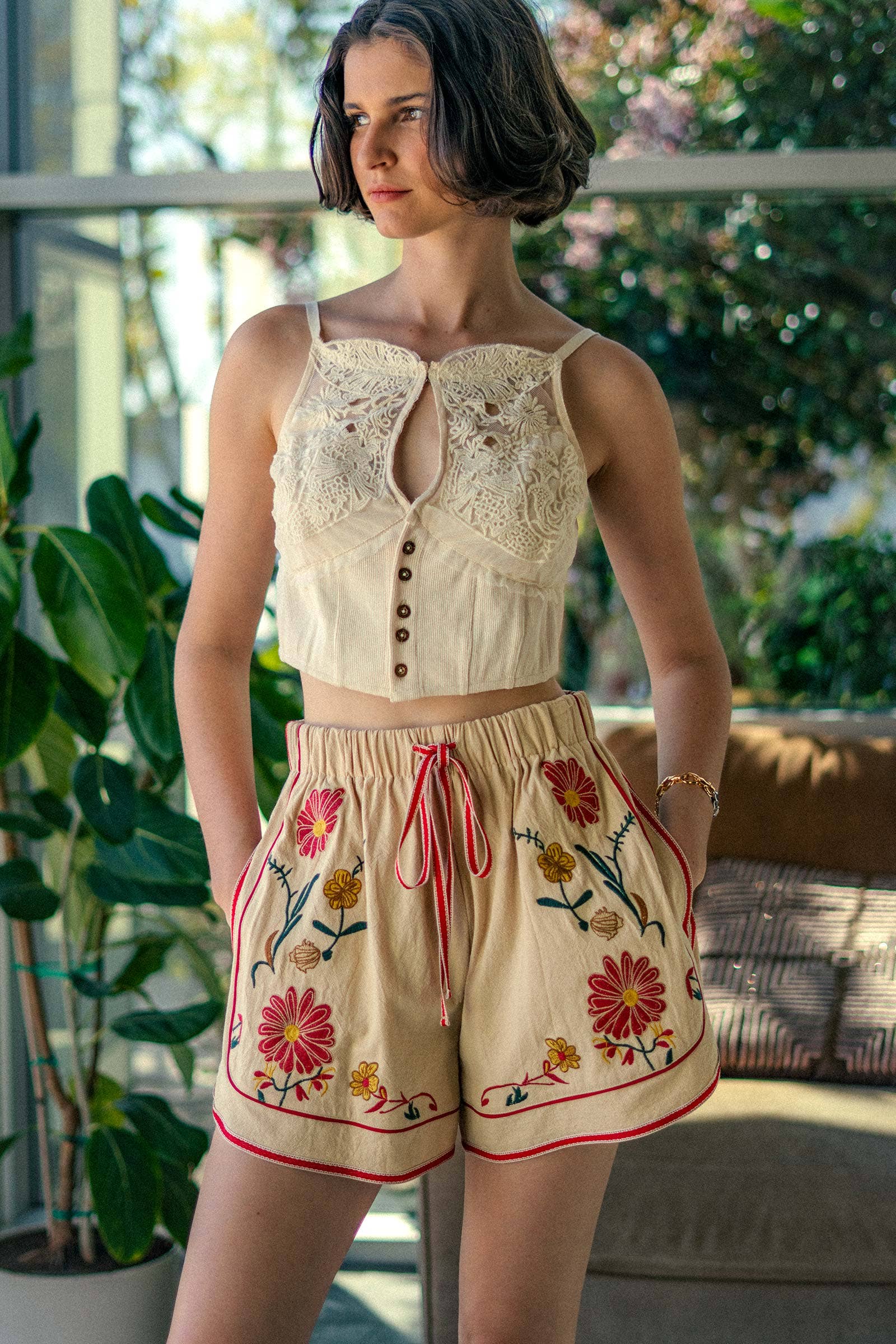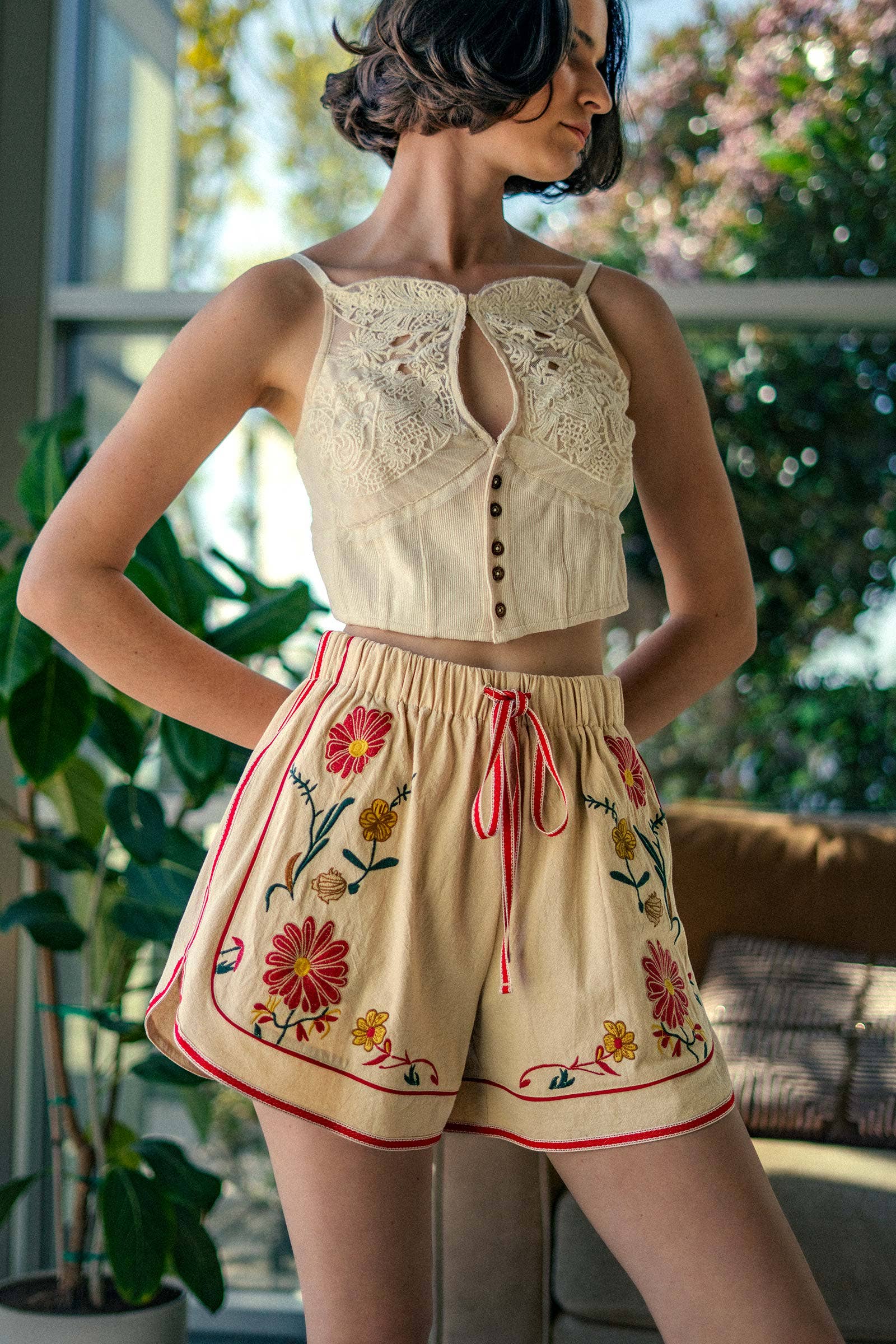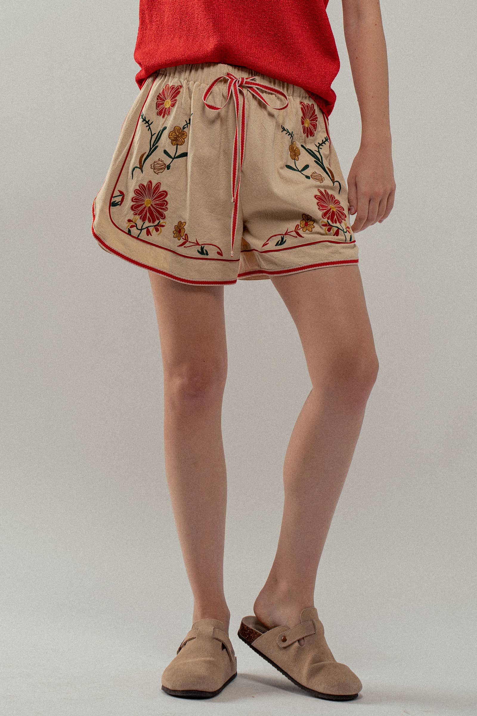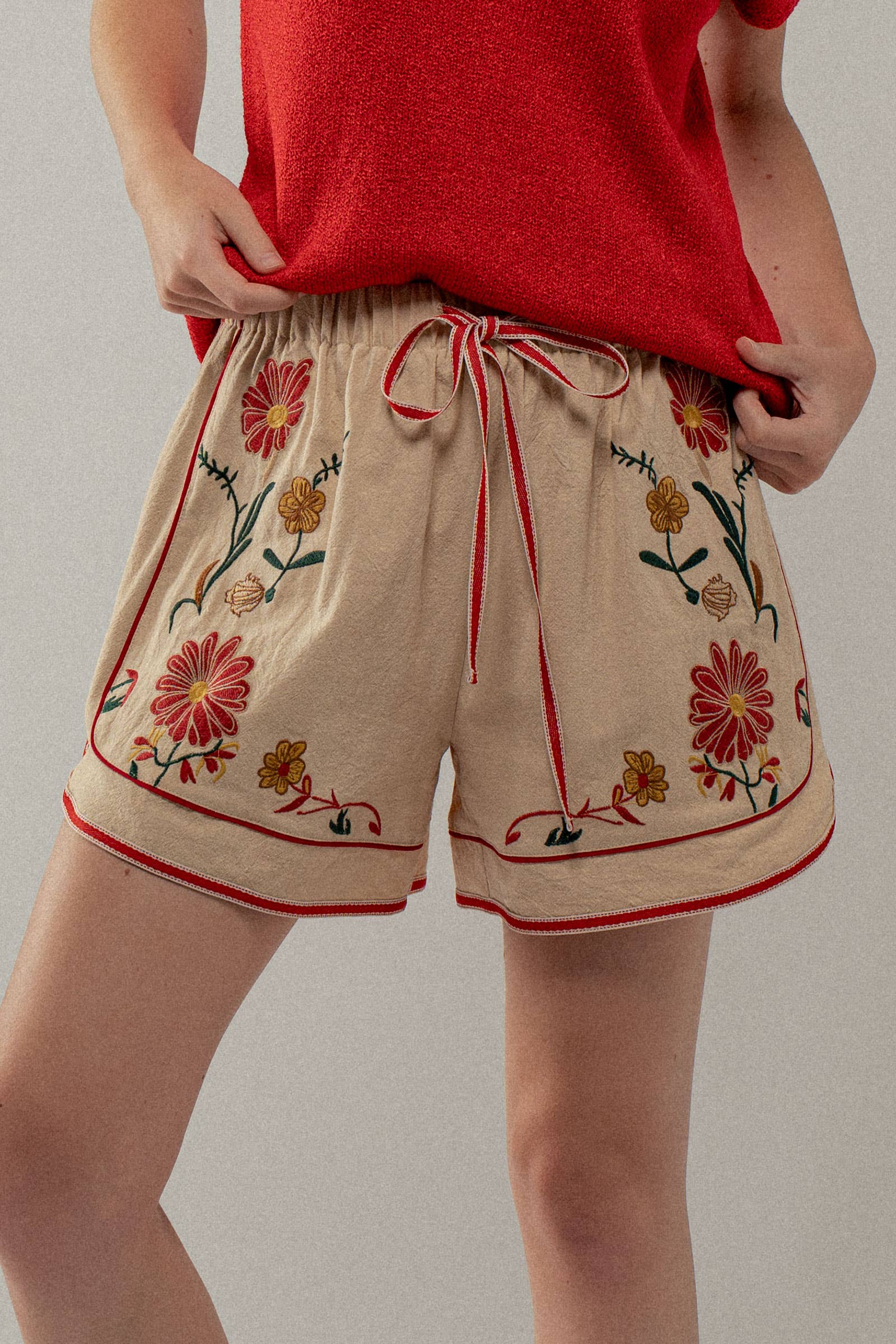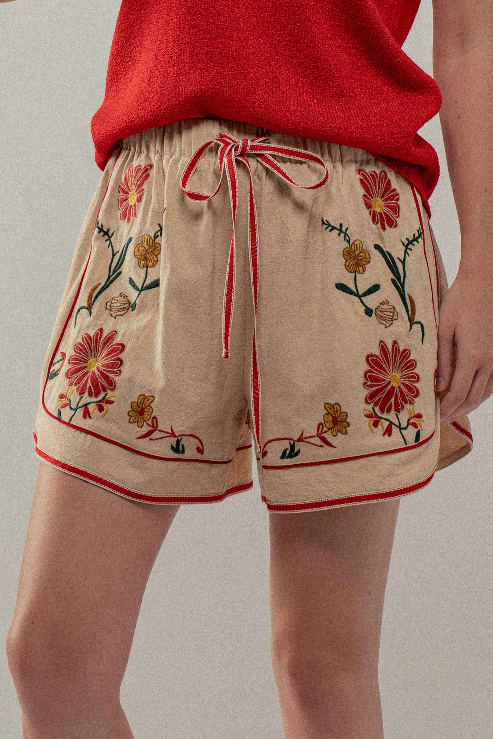 These artisanal shorts feature vibrant crimson daisies and golden blooms embroidered on a sandy canvas, framed by contrasting red piping. Crafted from 100% cotton, they offer a relaxed silhouette with scalloped trim, functional side pockets, and a decorative drawstring waist for effortless spring and summer styling.