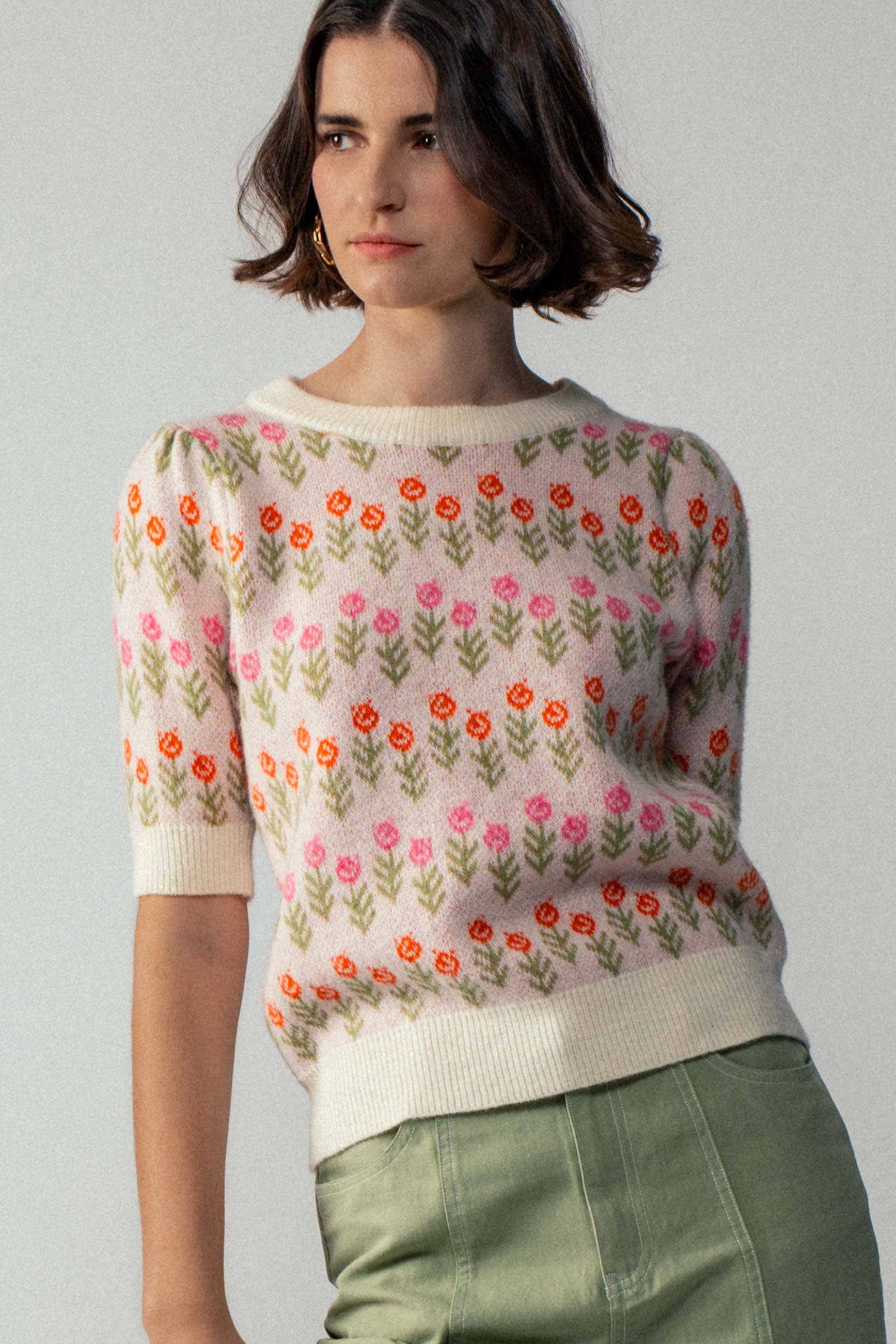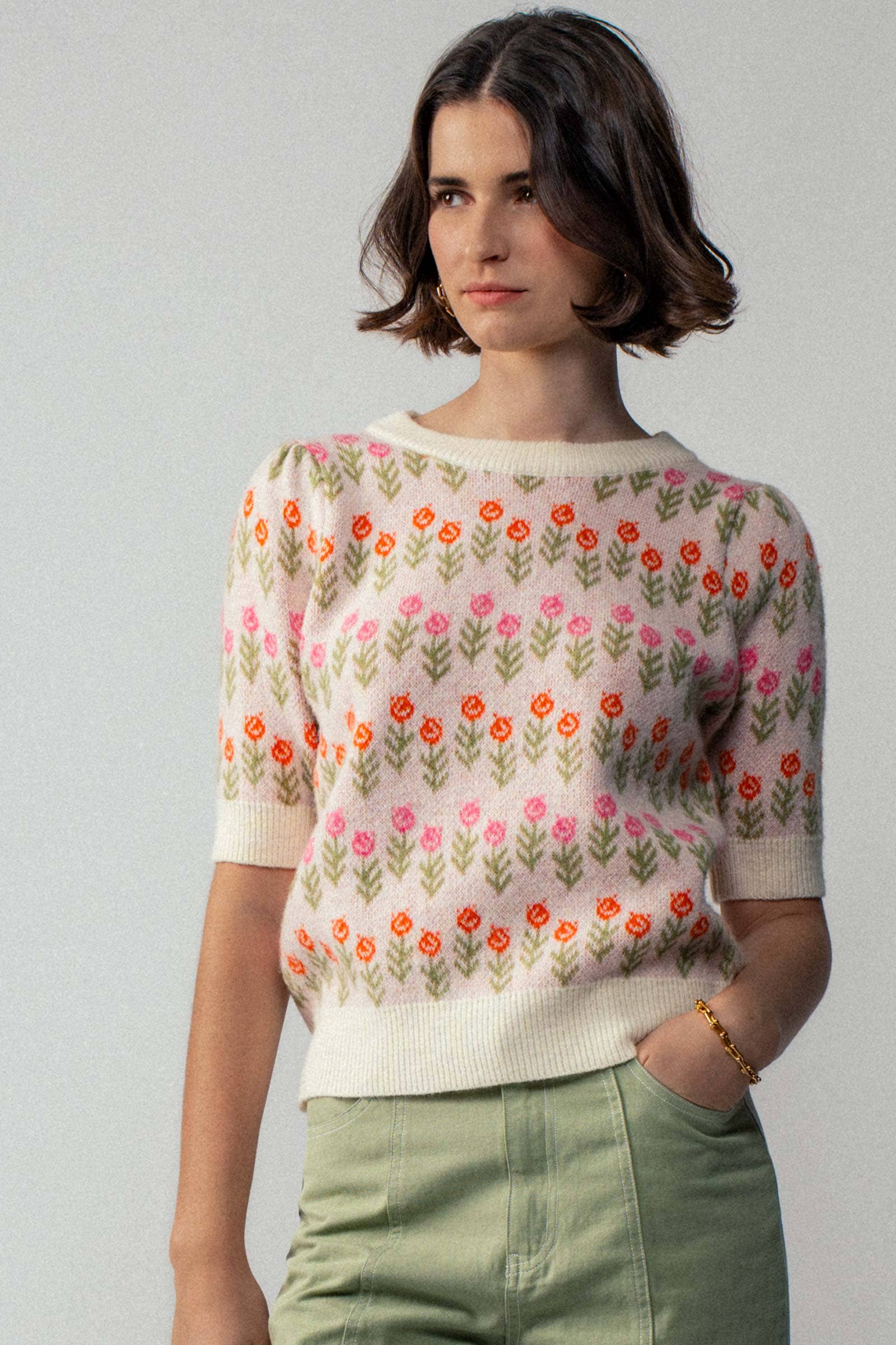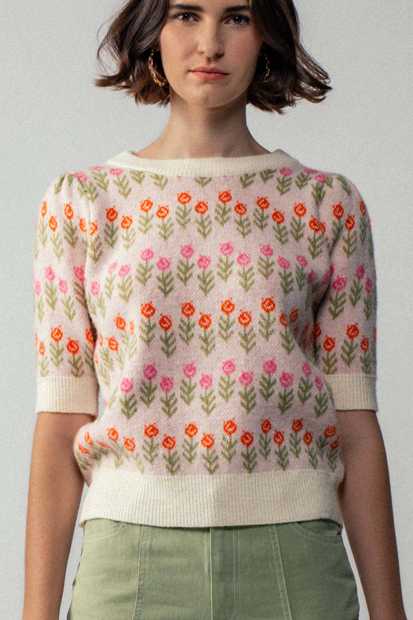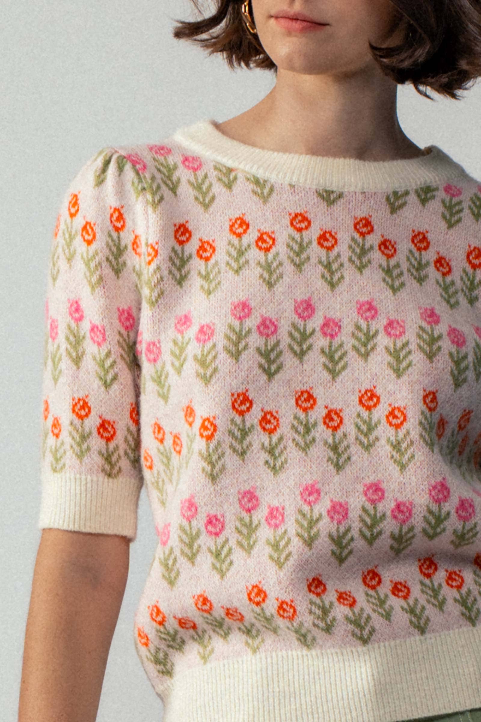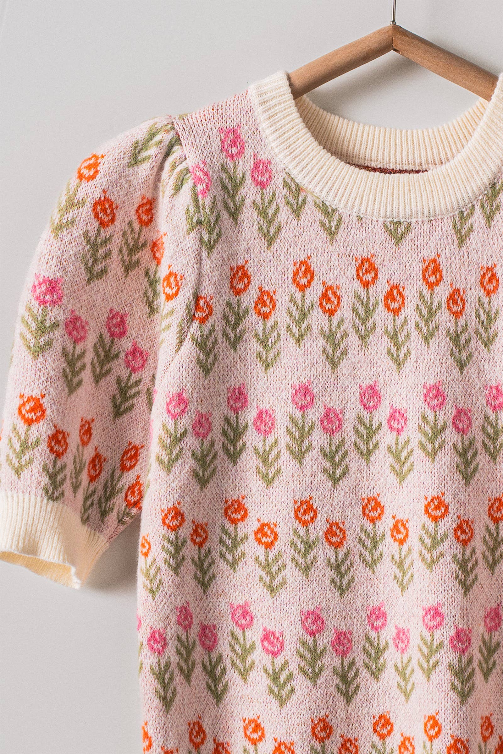 With an all-over floral pattern, a flattering crew neckline, and short sleeves, this sweater exudes a retro charm that’s both stylish and comfortable. The delicate knit features rows of stylized pink and orange flowers interspersed with green foliage on a neutral background, creating a vintage-inspired look. Features: • 65% Acrylic 20% Polyamide 15% Polyester • S/M-M/L: 3-3 • Soft knit fabrication for all-day comfort • Crew neckline and short sleeves • Ribbed knit trim at neckline, cuffs, and hem.