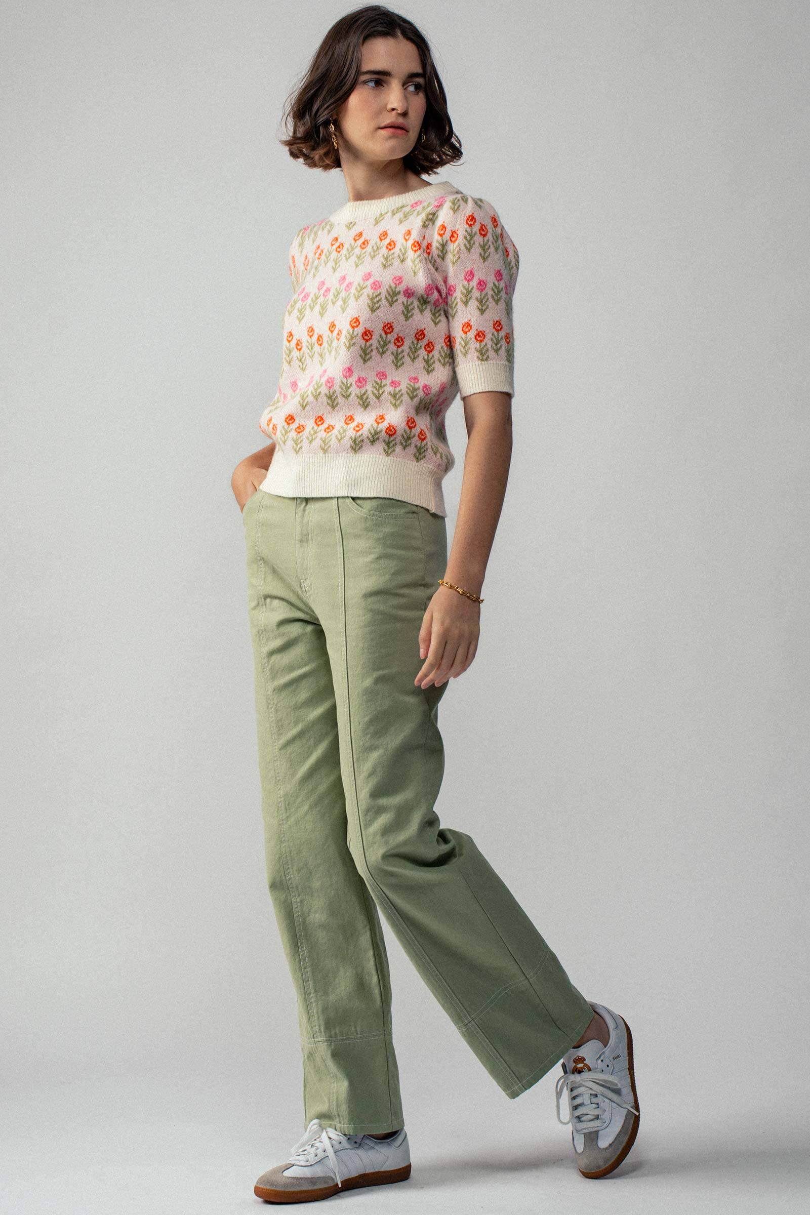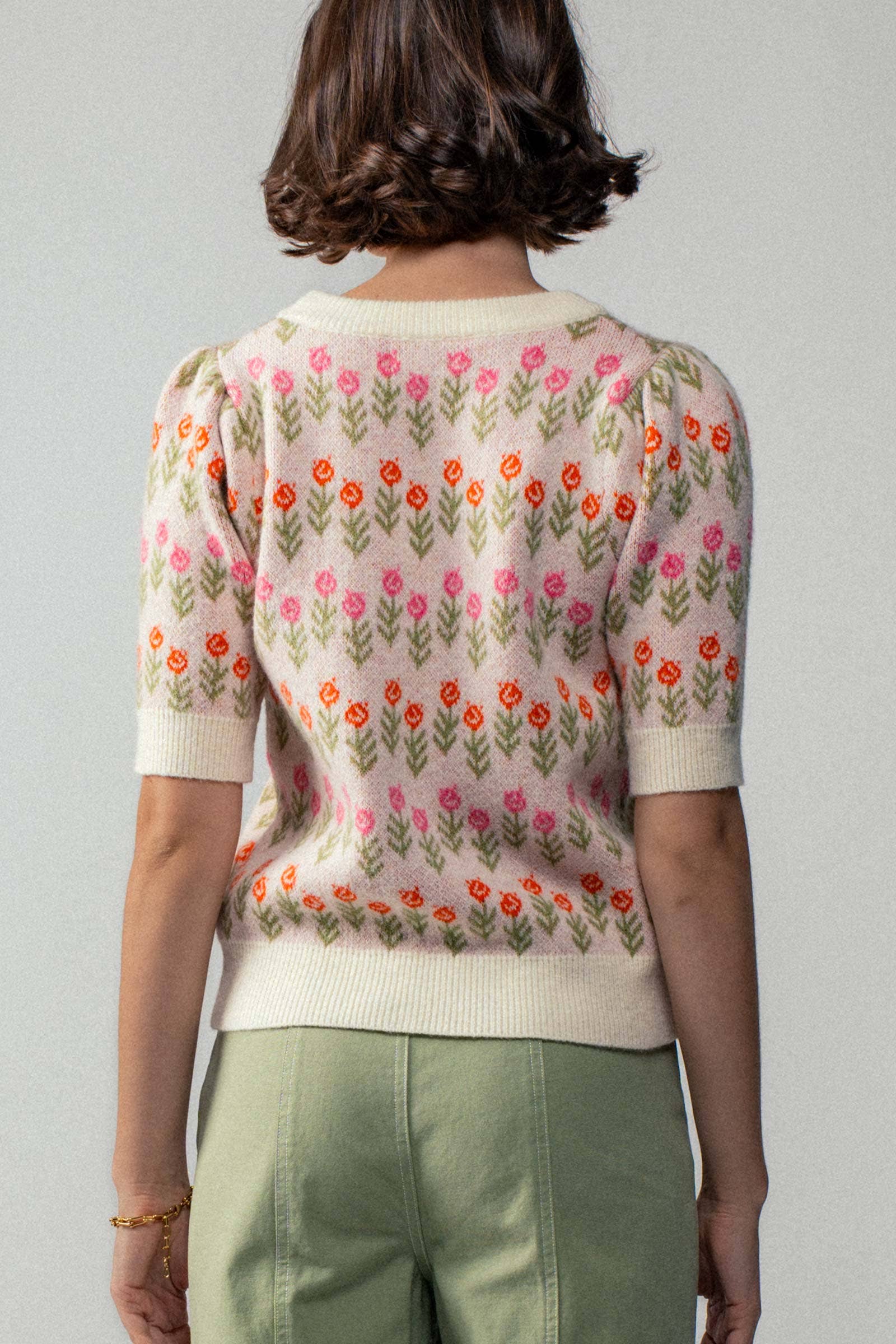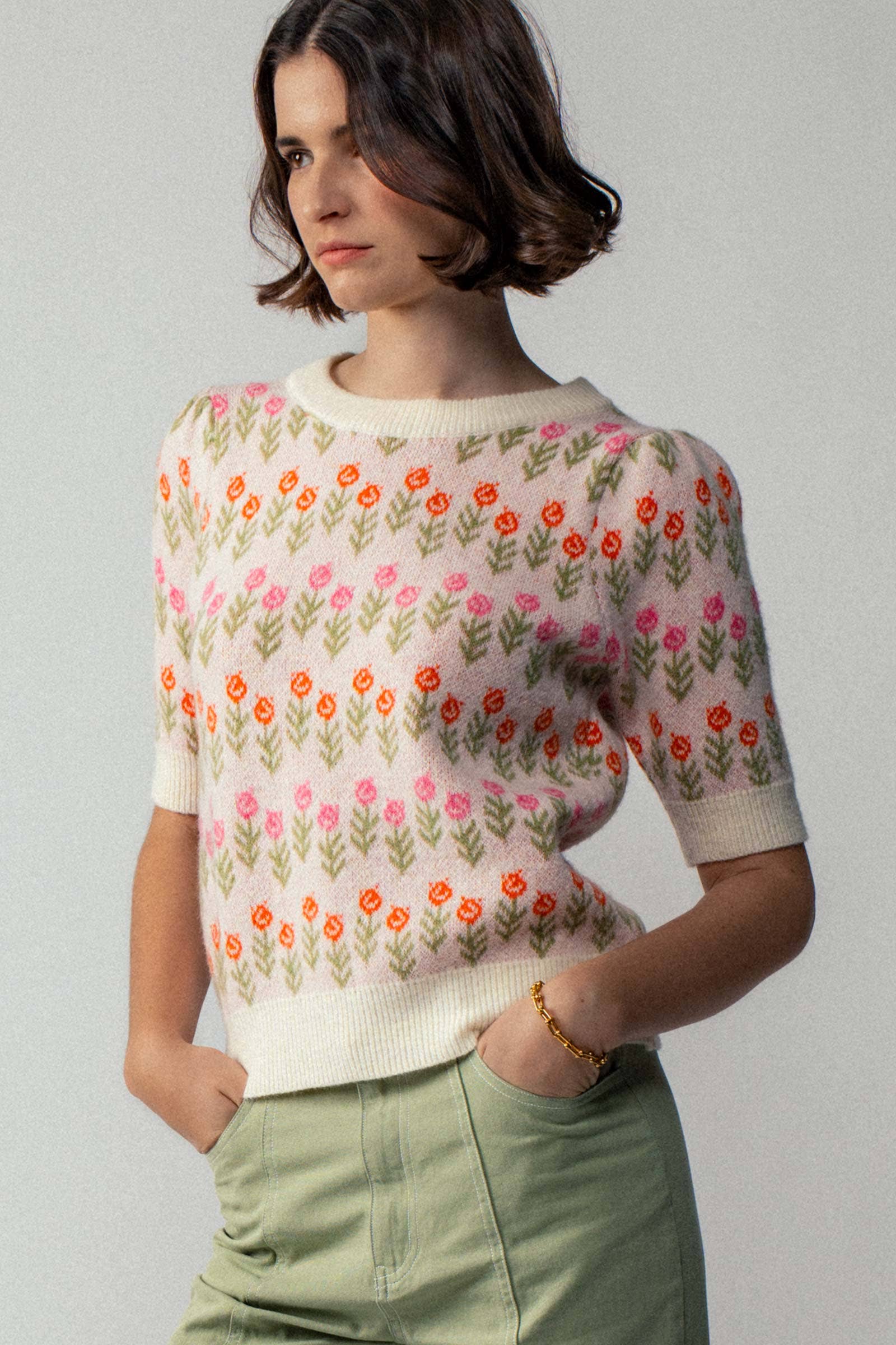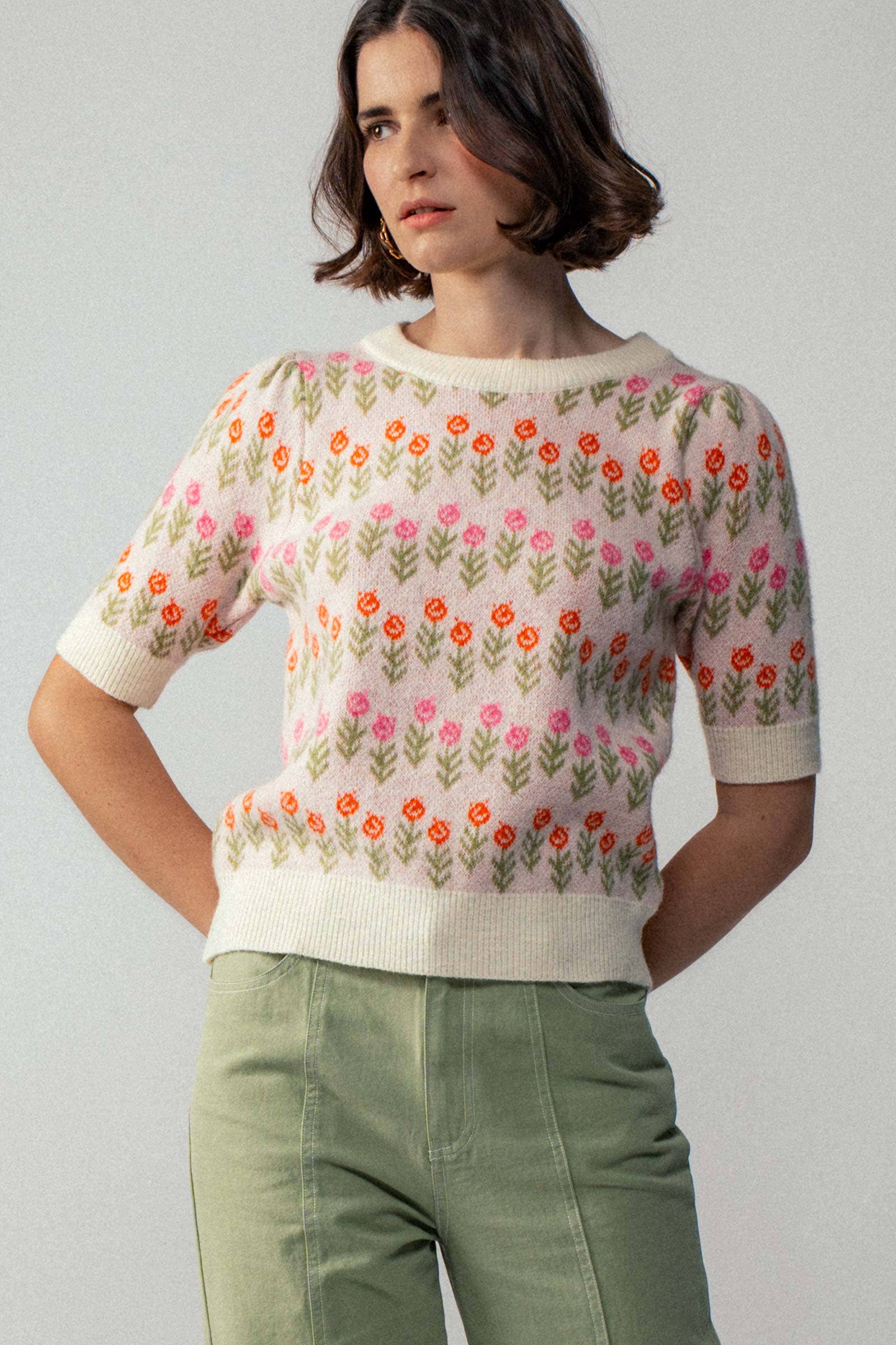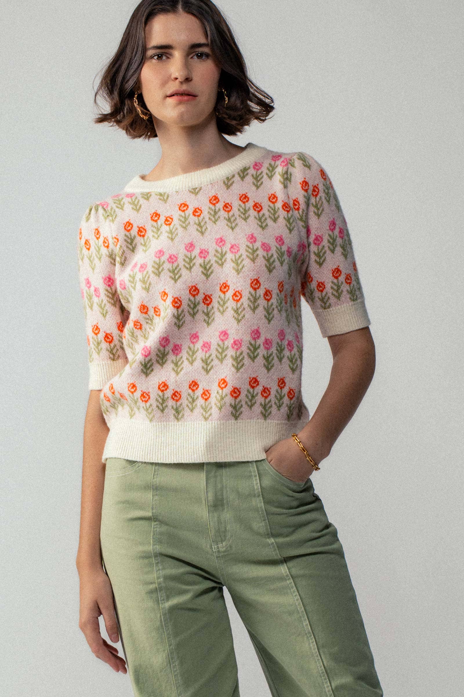With an all-over floral pattern, a flattering crew neckline, and short sleeves, this sweater exudes a retro charm that’s both stylish and comfortable. The delicate knit features rows of stylized pink and orange flowers interspersed with green foliage on a neutral background, creating a vintage-inspired look. Features: • 65% Acrylic 20% Polyamide 15% Polyester • S/M-M/L: 3-3 • Soft knit fabrication for all-day comfort • Crew neckline and short sleeves • Ribbed knit trim at neckline, cuffs, and hem.