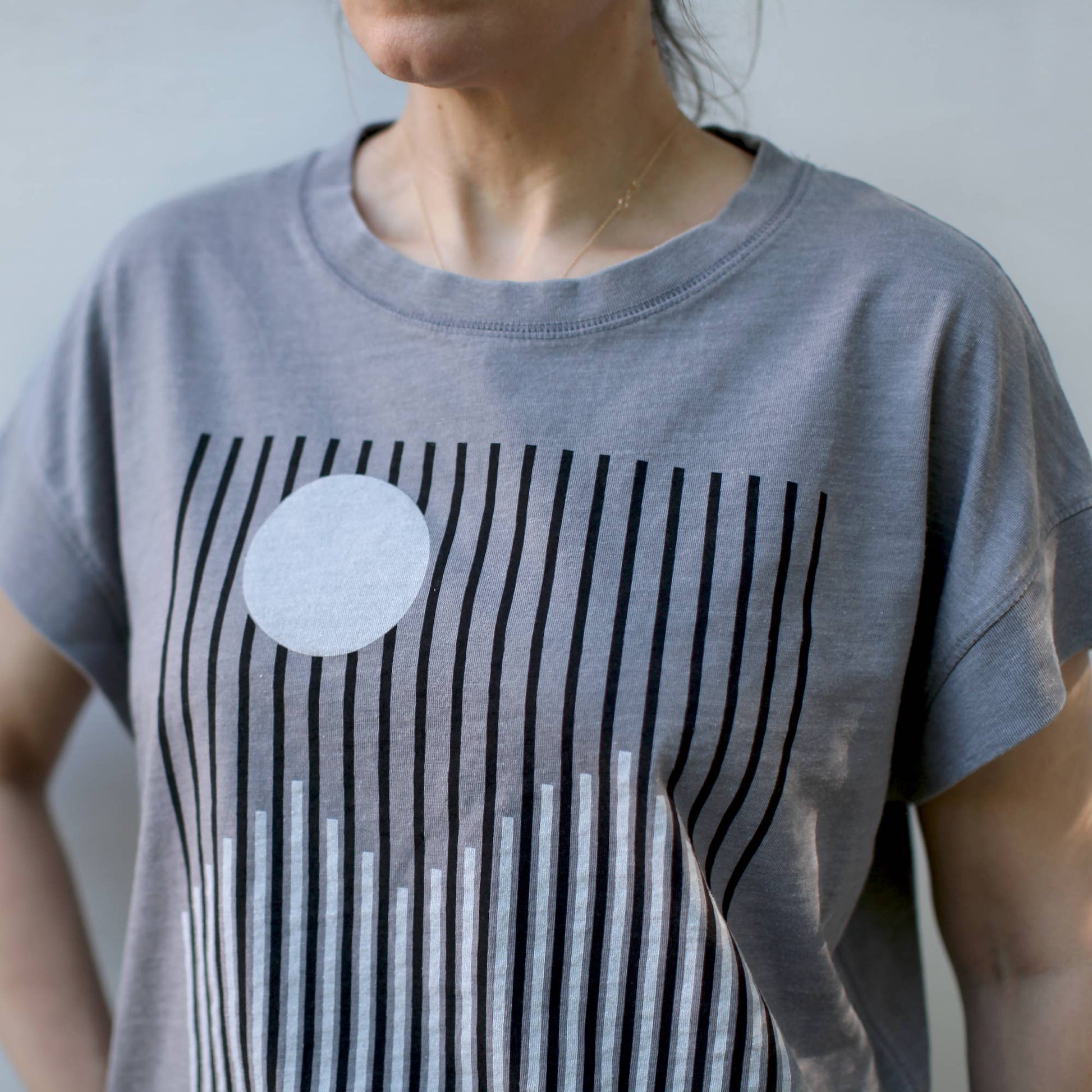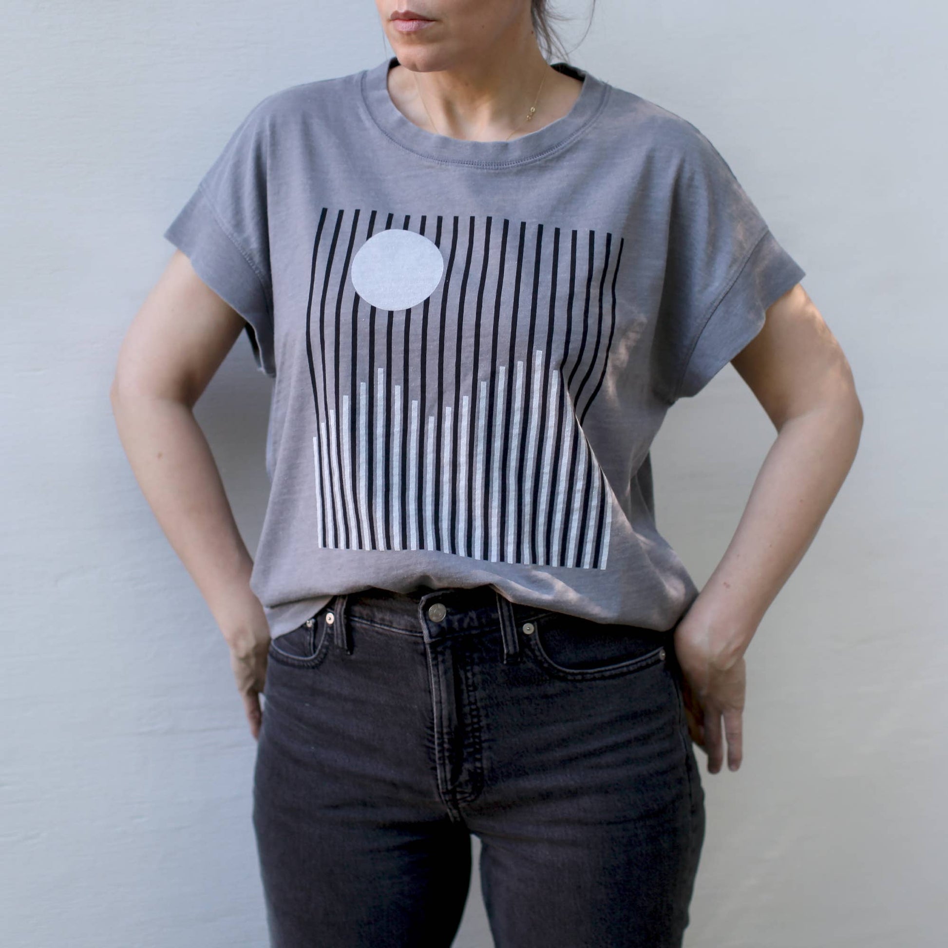 Color: gray. 52% polyester, 48% cotton. Our minimalist take on the alpine vistas at Glacier National Park features two icy peaks and pale full moon glowing against a dark winter sky. Printed on a cap sleeve jersey knit top. This comfortable style has the casual fit of a boxy top--but the super soft mid-weight fabric gives it a luxurious feel and a feminine drape. A truly accommodating style for a variety of body types, this roomy top has a similar fit to our popular rolled cuff tees. However, because it has a true boxy cut, it does run a bit larger. So we generally recommend sizing down.