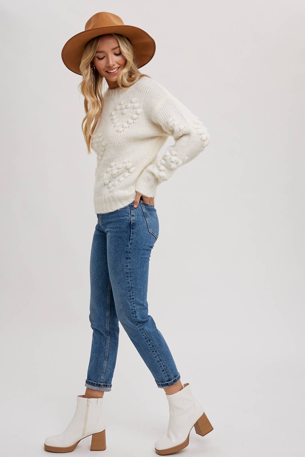 Introducing a delightful and charming heart-shaped pom pom sweater pullover that effortlessly blends comfort and playfulness. This pullover features a soft and textured knit fabric adorned with adorable heart-shaped pom poms. With its comfortable fit and relaxed vibe, this sweater pullover is perfect for staying warm while maintaining a fashionable look. The heart-shaped pom poms bring a cheerful and whimsical touch to your outfit.