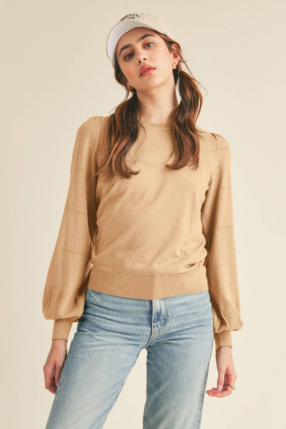 Pointelle puff sleeve sweater + Lightweight knit + Round neckline + Long puff sleeves with gathered shoulders + Pointelle knit detail on sleeves + Ribbed neckline, cuffs, and hem + Model is 5' 9.5" 33-24-36 and wears a S
