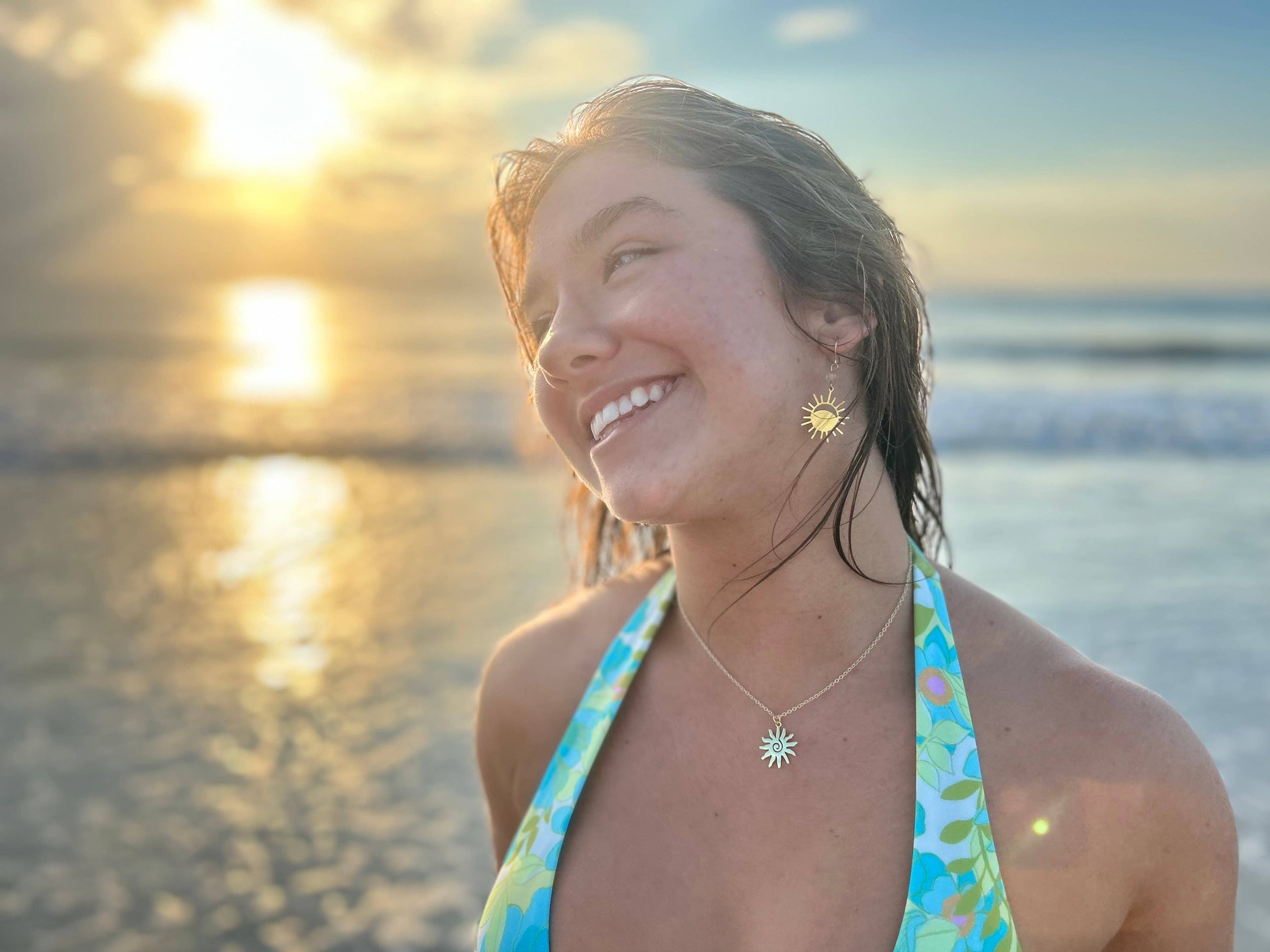 This spiral sun hangs on a 14k gold plated solid brass chain, adjustable to wear as a 16", 17" or 18" necklace