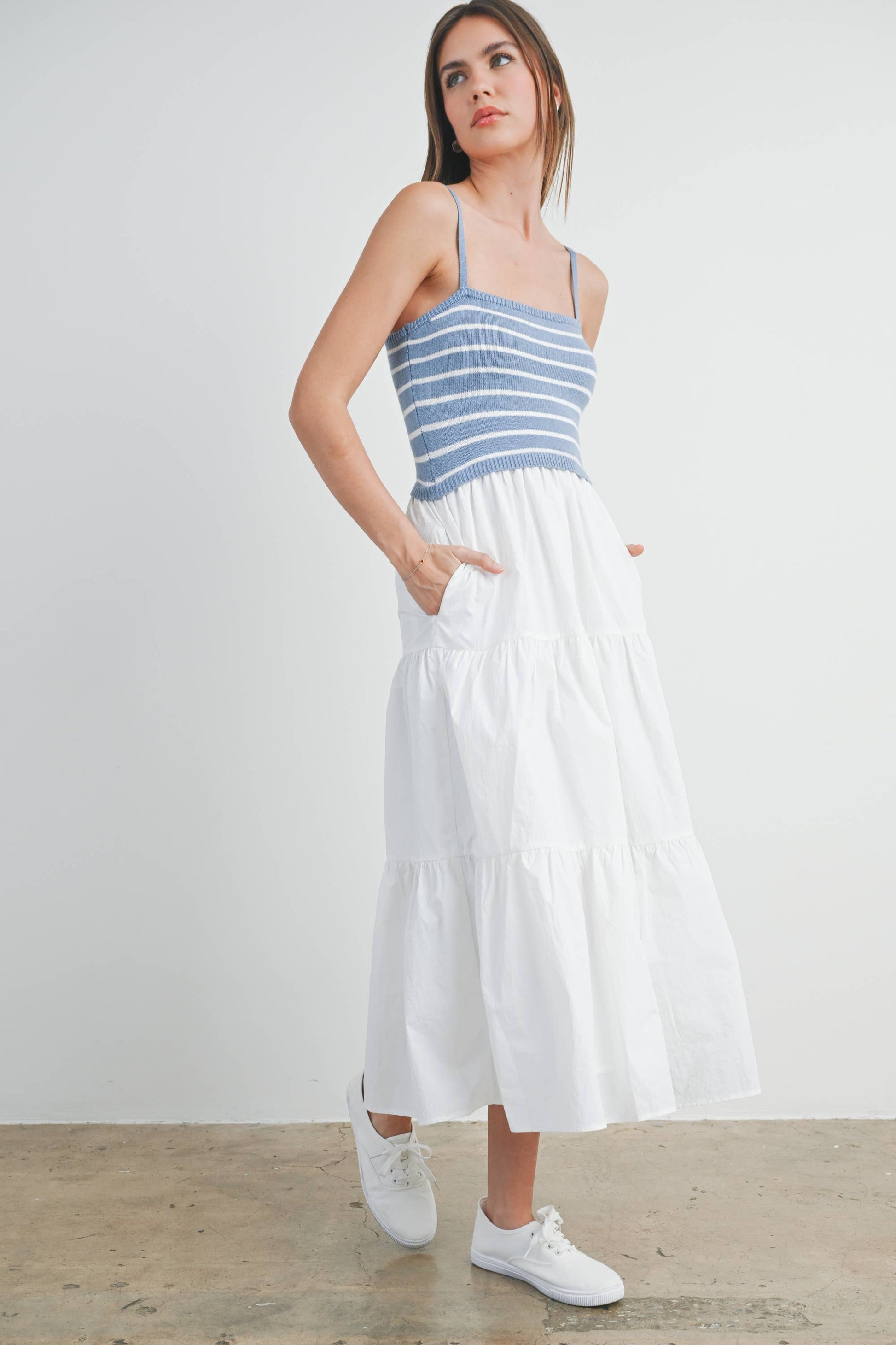 Elevate your wardrobe with our Striped Knit Top Tiered Maxi Dress. Featuring a chic striped knit bodice and a flowy tiered skirt, this dress combines comfort and style effortlessly. Perfect for casual outings or dressed-up occasions, it's a versatile piece you'll love all season long.