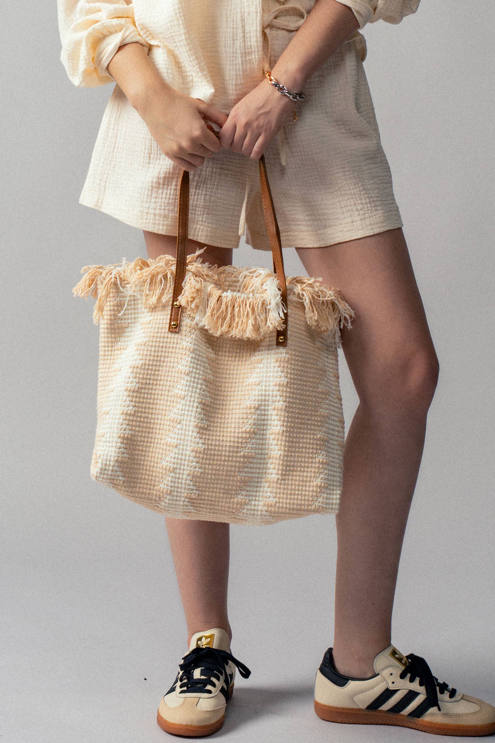 Features: • Self 70% Rayon 30% Polyester • Textured geometric pattern for visual appeal • Faux leather straps for durability • Fringed top edge for boho charm